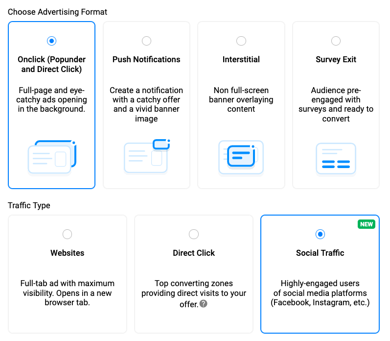 You can already find this targeting on the Self-Serve Platform (SSP) in the Campaign Creation tab. Select the Popunder ad format and scroll down to choose from the available traffic types: Websites, Direct Click, and now Social.