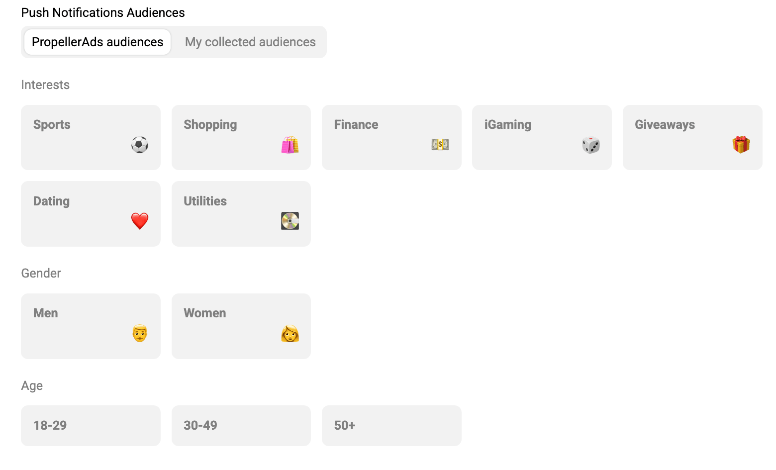 And by the way, PropellerAds has an efficient targeting feature for those who want to target users precisely by their interests and demographics (for Push):