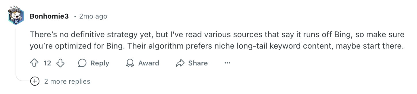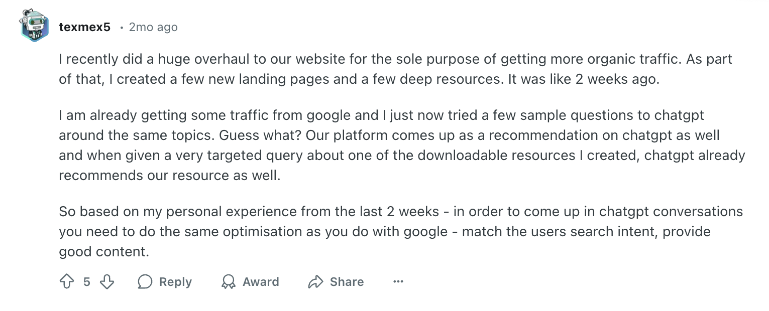 Redditor texmex5 revamped their site with new landing pages and deep resource pages. Two weeks later? Bing and ChatGPT were recommending their content on niche queries.