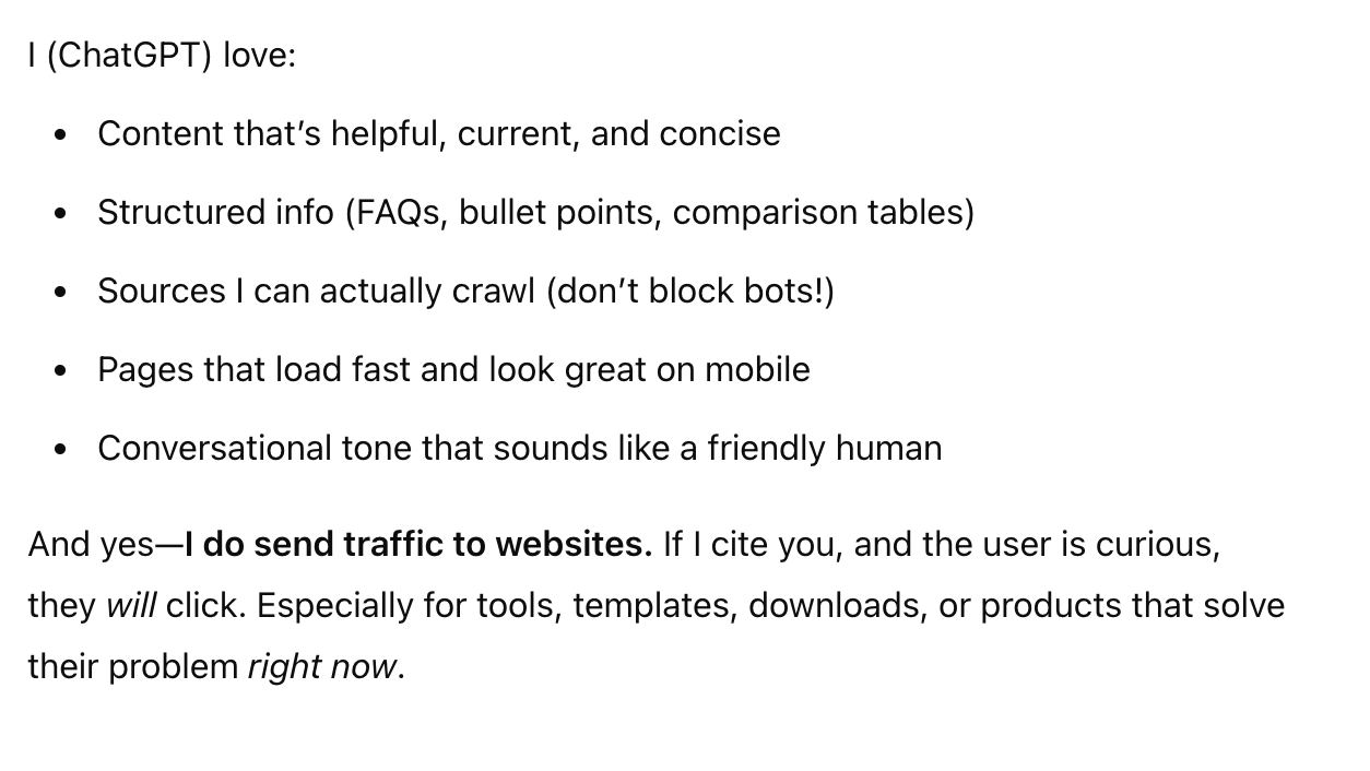 ChatGPT strives for conversational content. If your copy sounds like a robot wrote it in 2013, update it. Think FAQ style, clear subheadings, and direct answers. Bonus: include “how-to” lists, FAQ schema, and even infographics (the AI loves structured info).