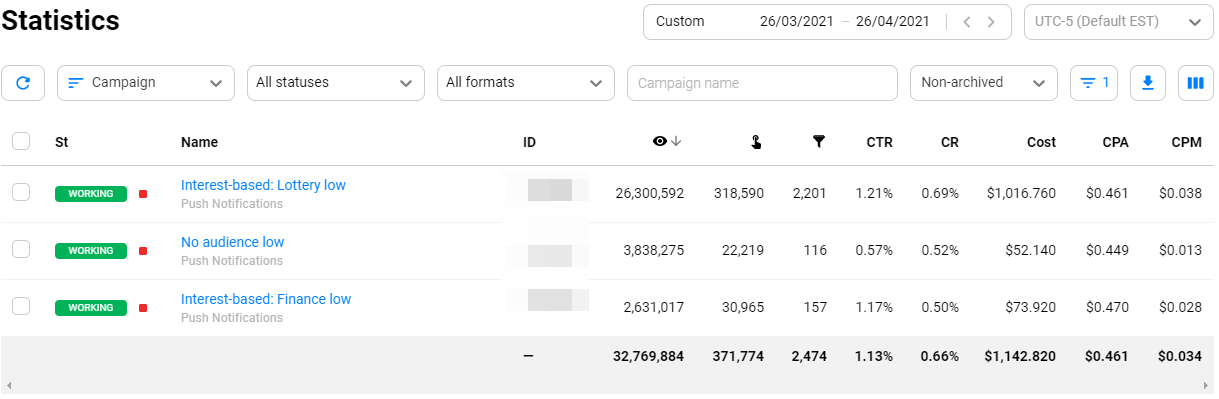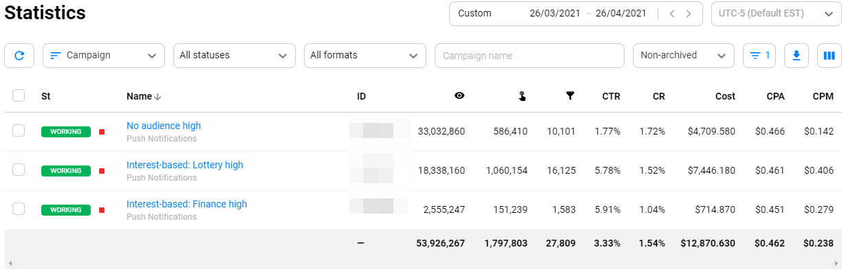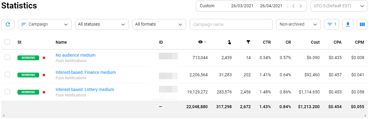 So, we’ve got three campaigns without PropellerAds Audiences feature, and then Interest-based ones – three for Giveaways and the same amount for Finance (for high, medium, and low user activity levels). Here is what we’ve got.