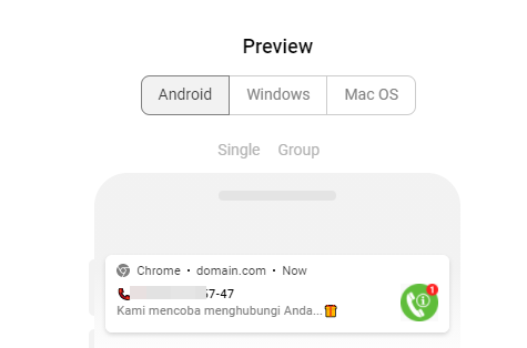 The text is Indonesian and it is translated as “We are trying to contact you…” The icon with a small gift suggests that something really pleasant is waiting for the user. And the entire notification looks neat, decent, and trustworthy. It’s hard not to click!