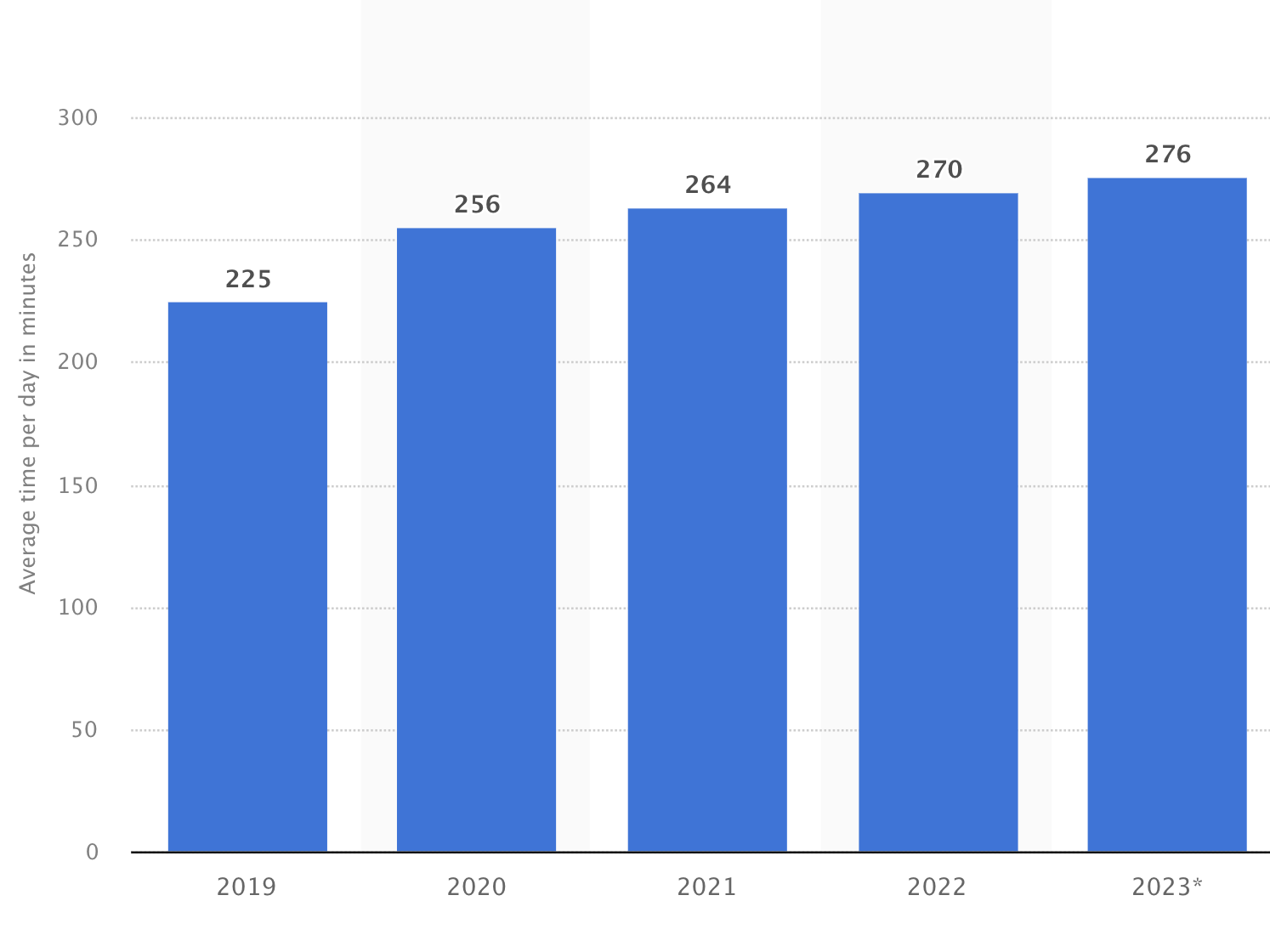 Also, the time users spend on their mobiles has increased over the years. According to Statista, from 225 minutes people spent on their phones daily in 2019, we are not at 276 minutes in 2023. That’s almost an hour longer.