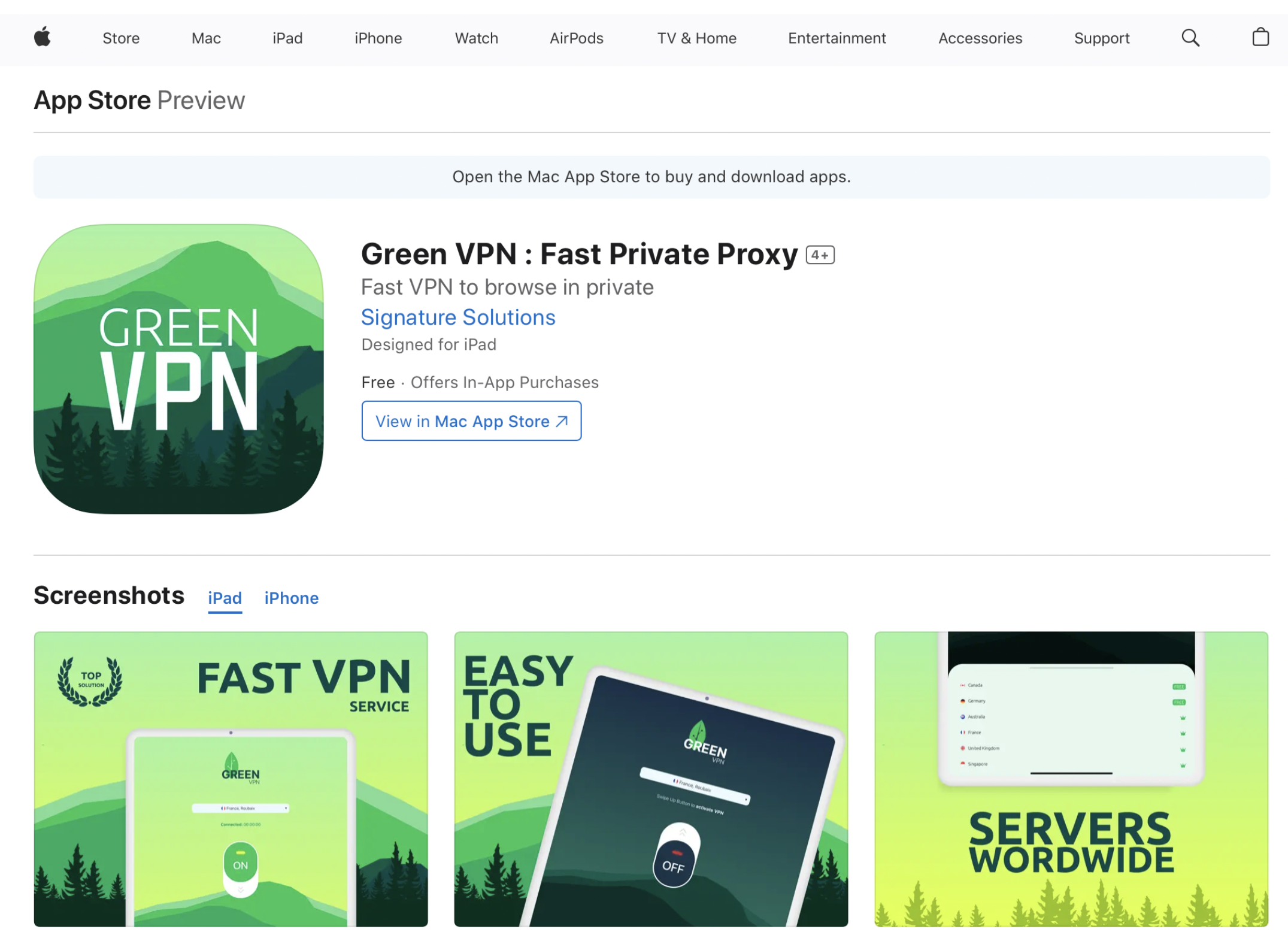 | Green VPN Security | 9334 | US, NZ, AU, CA, JP, GB | iOS | Free trial | $8.25 |