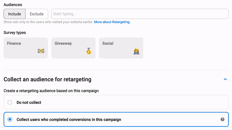 - Such users are highly engaged with all offer types, but if you want extra targeting, you can choose a Survey type (Finance, Giveaway, or Social) to focus on specific audiences.