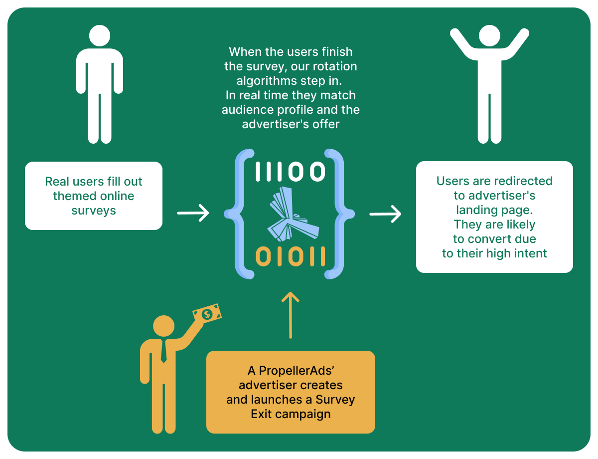 - Users with real intent: the Survey Exit format is your best opportunity to reach a highly-active audience carefully filtered by PropellerAds’ anti-fraud algorithms, which ensures that only real users will see your offer