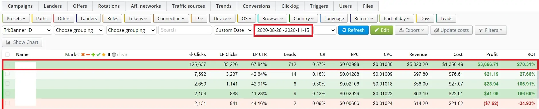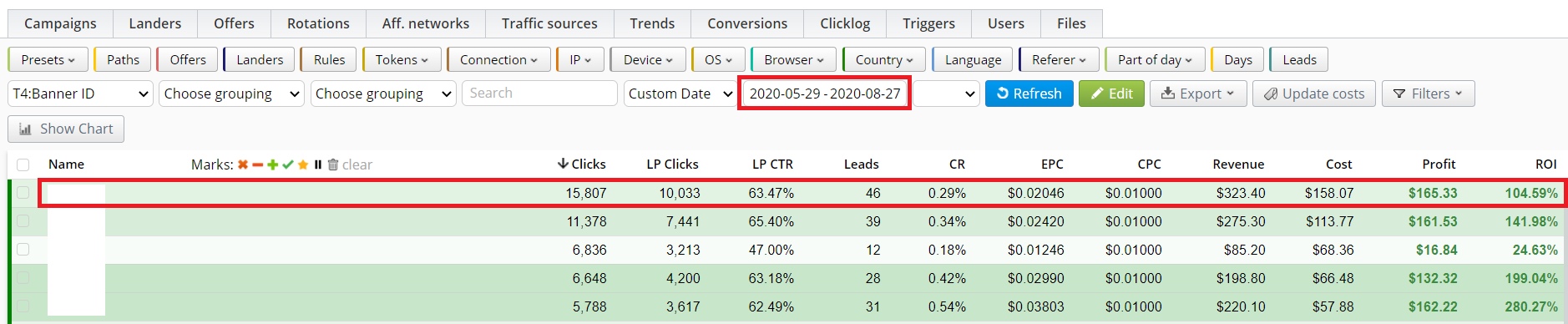 In the screenshot, we see that between 29/05/2020 and 27/08/2020, our creative didn’t have a high ROI compared with others from the same Ad campaign. Please pay attention to the amount of traffic and profit received for almost 3 months.