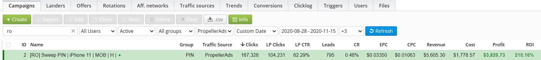 | Traffic: Push ads Affiliate Network: Lead Hits Offer: Sweepstake Testing period: 28/08/2020 – 15/11/2020 GEO: Romania Spent: $1778 Income: $5605 Revenue: $3827 ROI: 215%+ |