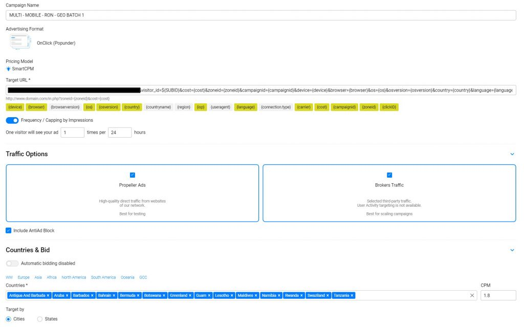I took my time to copy and paste each allowed GEO in the offer description in the PropellerAds Campaign Creation window. Once the first campaign is created, you can easily duplicate it, creating additional ones to test more zones and remove under-performing countries.