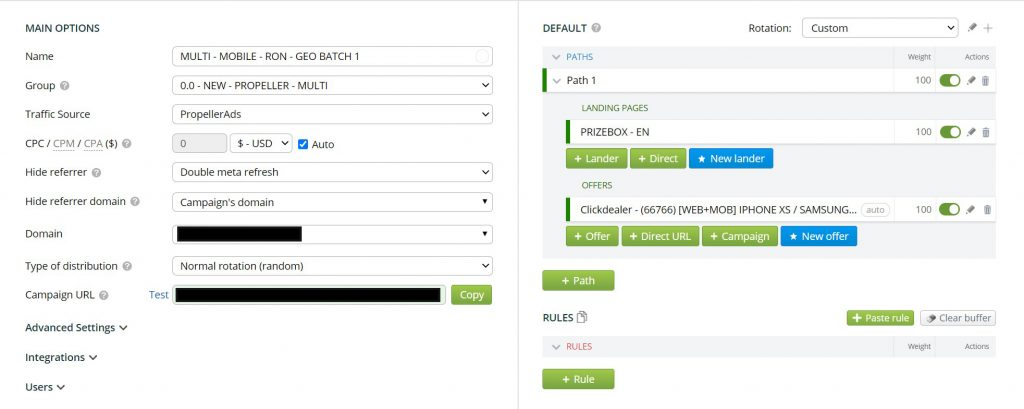 Here are my exact tracker settings for this campaign. Binom automatically tracks PropellerAds costs, but make sure to set your cost to CPC and check off “Auto.”