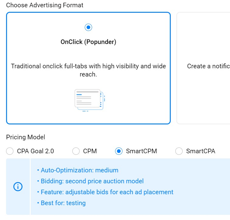 The campaign setup is rather intuitive. After choosing a campaign name, select OnClick (Popunder) for Advertising Format and choose SmartCPM as your pricing model.