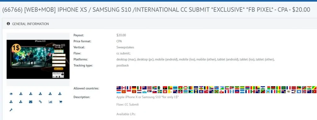 It was available in multiple landing page variations (Samsung, iPhone, and their variations), but to be honest, I’ve only grabbed the very first tracking link that I later combined with an iPhone landing page, without even checking if that’s what the claimed prize was for that particular link variation.