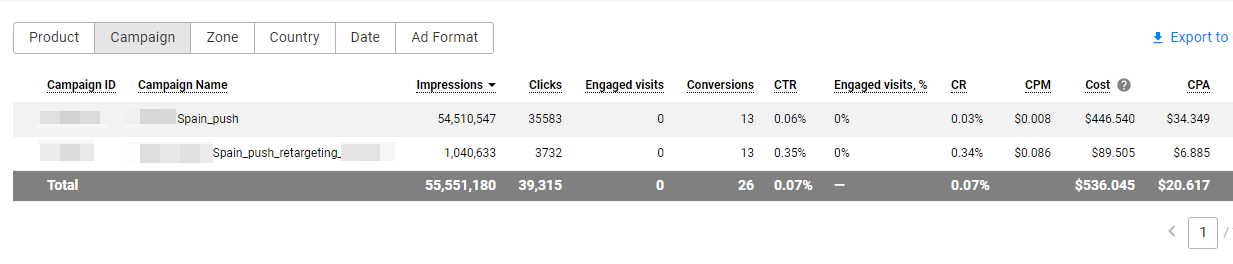 One of the campaigns was launched with a wide targeting, using all PropellerAds traffic.