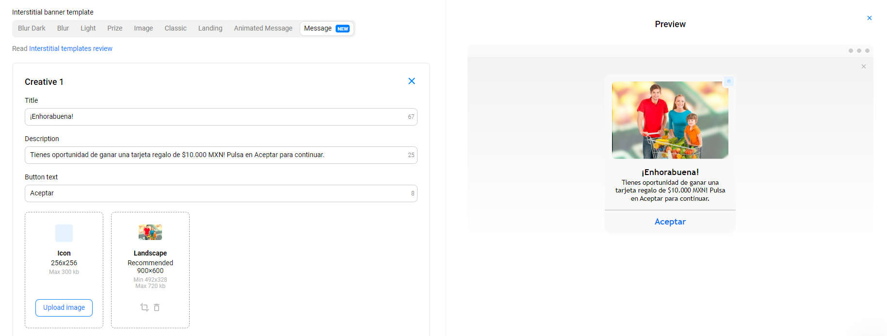 Meet Message and Animated Message — two brand new Interstitial templates, ready to go and already waiting for you on the SSP (self-service platform). In a couple of minutes, you can make a super-clickable creative with higher conversion rates than ever before.