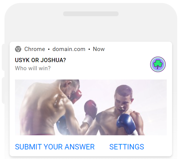 If you are running Popunder ads, you don’t need extra creatives — just a landing page. Push notifications work nicely when you adjust them for a particular fight, like ‘Guess who wins? Fighter A or Fighter B?’ or Who gets KO’d?’ or something like that.