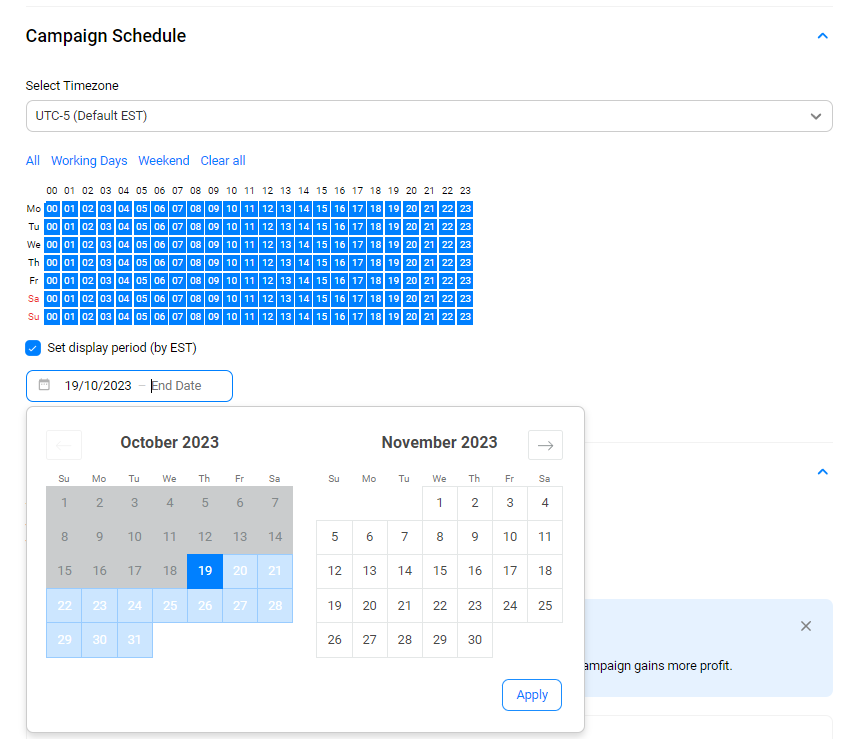 If your creatives are related to a particular fight, don’t forget about limiting your campaign’s time. It doesn’t make sense to go on with such creatives after a bout, so use the Campaign Schedule feature.