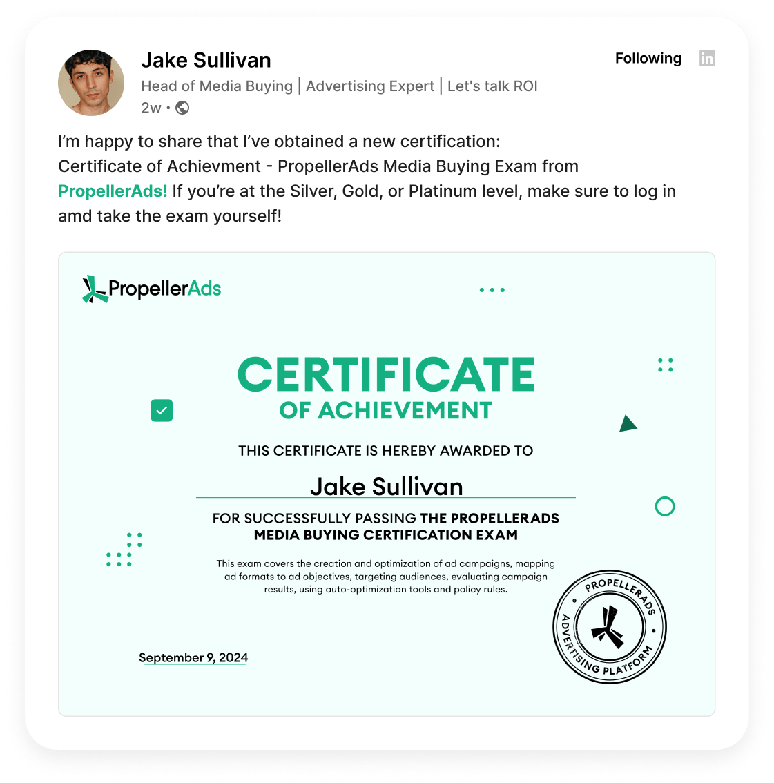 Smooth step-by-step start for your first campaign.Test your knowledge and earn a Media Buyer digital certification badge