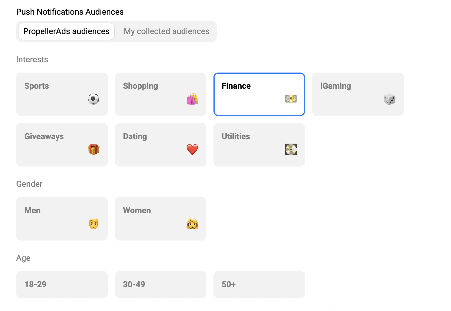 - Reach Finance-interested audience via PropellerAds Demographic and Interests Targeting;