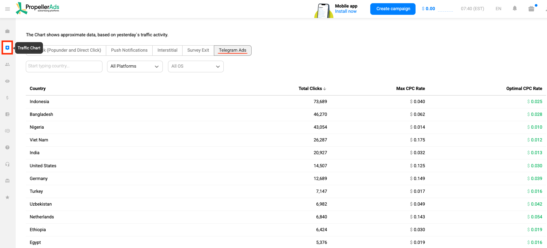 “Product owners and brands are usually interested in WW (worldwide) traffic. If this is also relevant to you, please make sure to check the traffic chart in your PropellerAds account to see which GEOs can deliver large traffic volumes”.