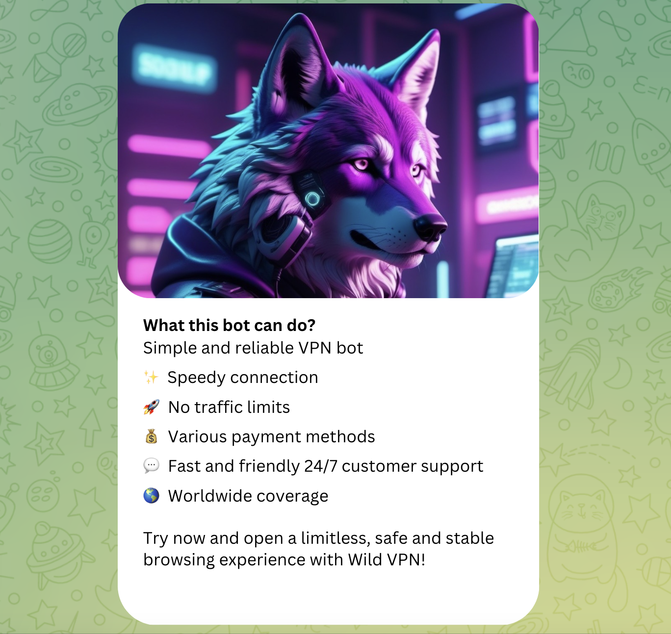 The next product in our Telegram top list is a VPN bot, also developed and owned by one of our partners. Check his advertising approach: