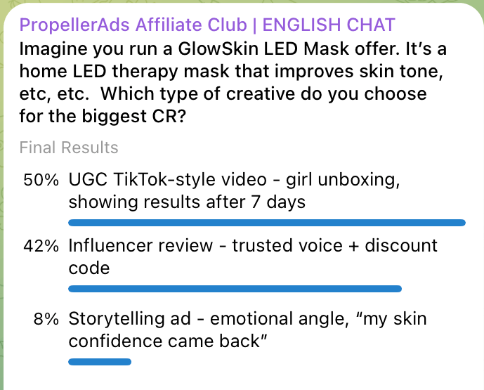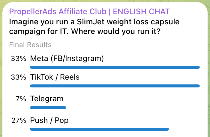 And here is what affiliates from the PropellerAds Telegram Chat think about traffic sources: