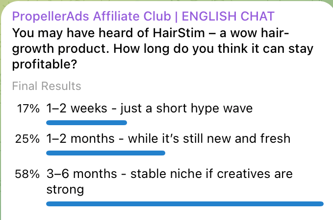 Here is a piece of an affiliates’ survey from the PropellerAds Telegram Chat: