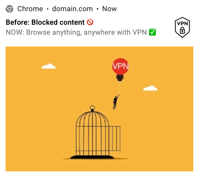 The same VPN but reframed: a broken cage and freed user, sign “Before: Blocked content. After: Browse anything, anywhere.” You can also play with wordings like “Unlock My Access”, and small lines like “30-day money-back guarantee”.