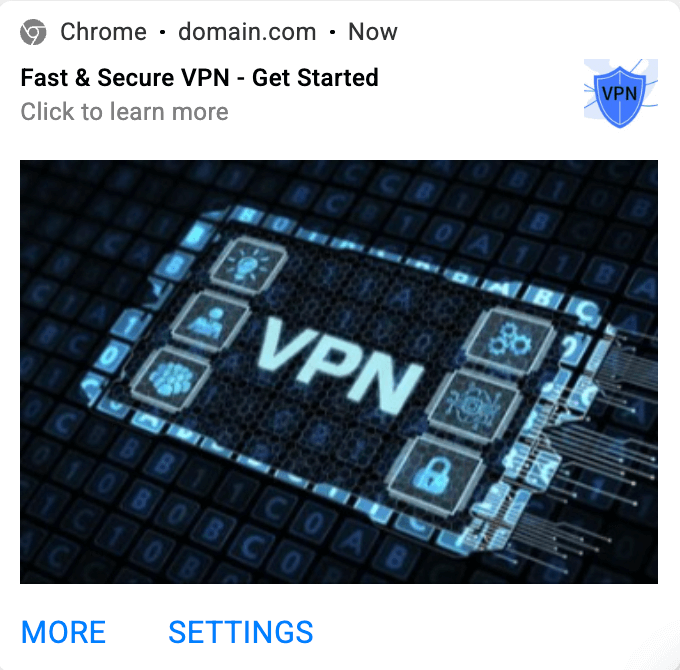 A generic banner for a VPN offer: “Fast & Secure VPN. Get Started.” Blue background, logo, and a “Learn More” button. The CTR is decent – people do care about VPNs – but the conversion rate is low. Users click, look around, and leave.