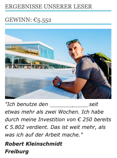 “Estou usando a [platform name] há cerca de duas semanas. Investi 250 euros e ganhei 5.802, muito mais do que eu recebo no meu trabalho.” – Robert Kleinschmidt, Freiburg