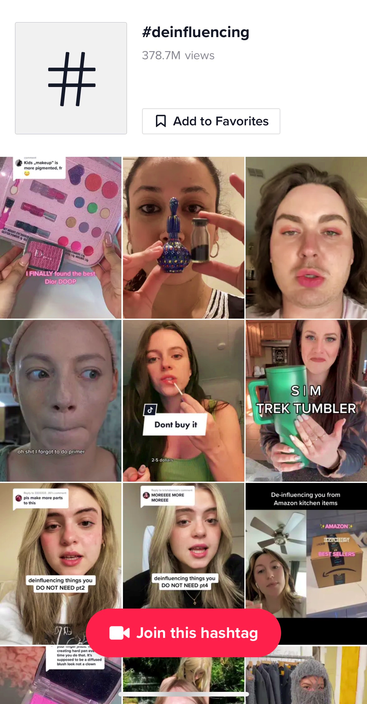 Com certeza! Veja como a tendência de desinfluenciar por vídeos é representada no TikTok. Como você pode ver, essa tag tem 378,7 milhões de visualizações: