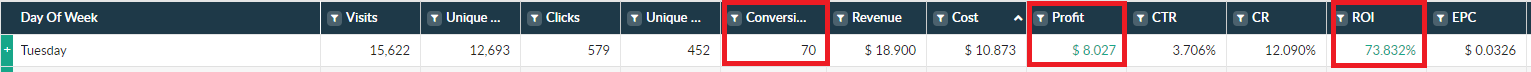 Can you imagine that? The very first campaign ever and 70 conversions/73% ROI just within a single day. We even started doubting he was a newbie!