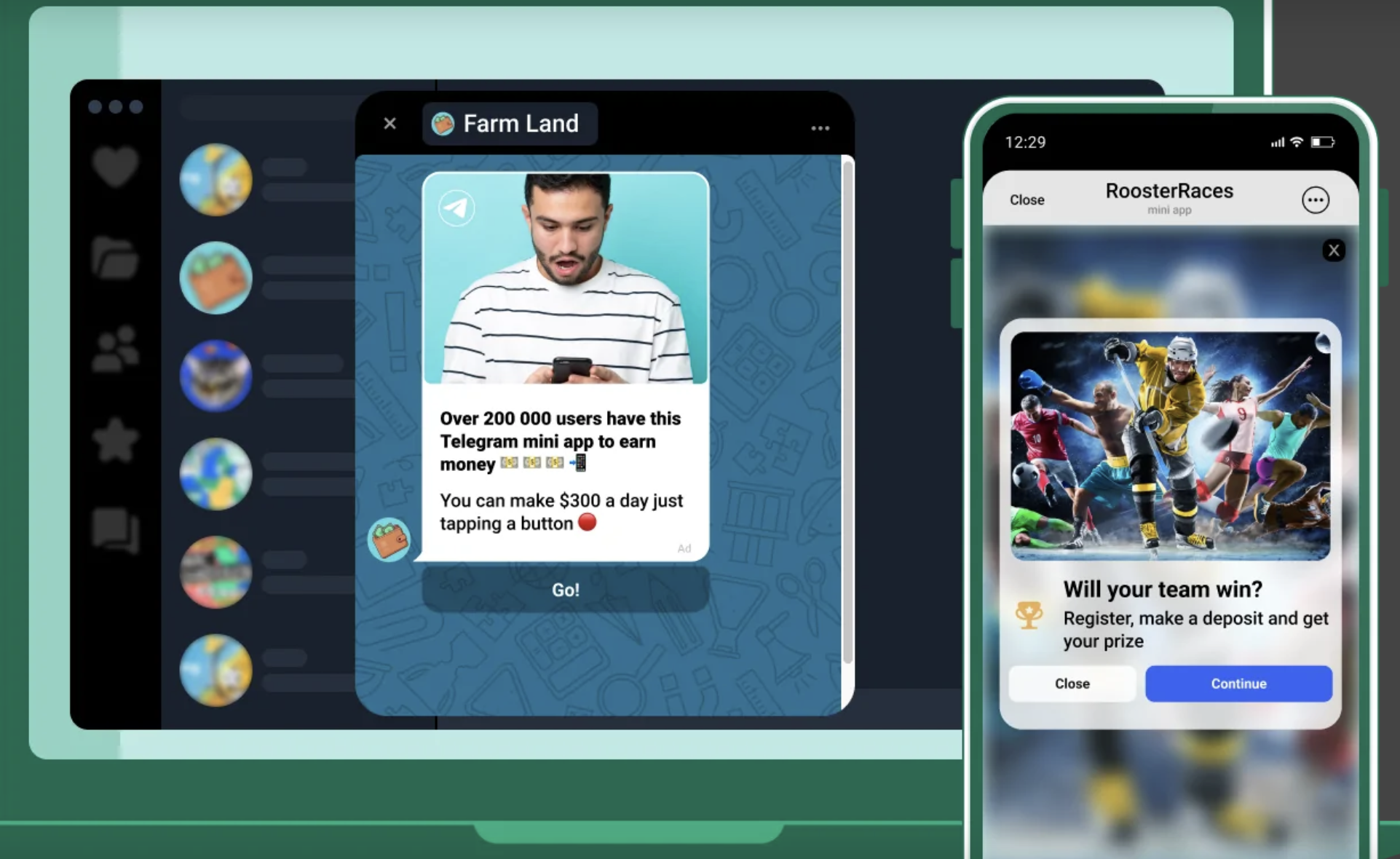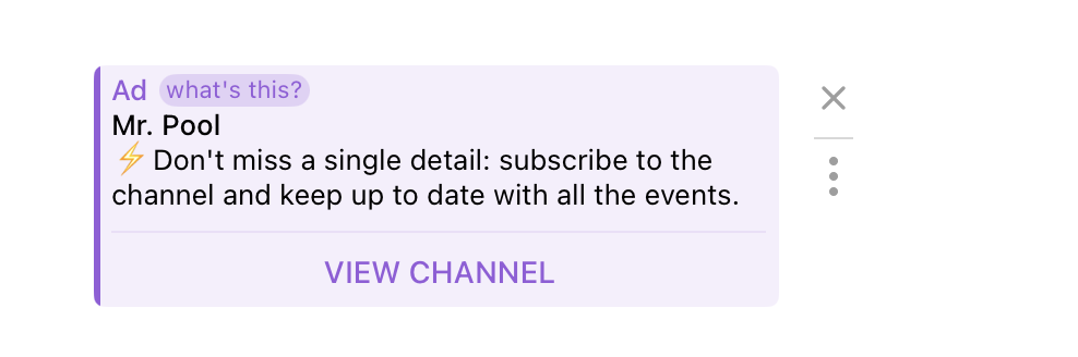 - Anúncios em Mini Apps do Telegram. Esse é um formato exclusivo da PropellerAds que permite que você exiba anúncios nos miniaplicativos do Telegram. Aqui está um exemplo de como o usuário vê esse tipo de anúncio: