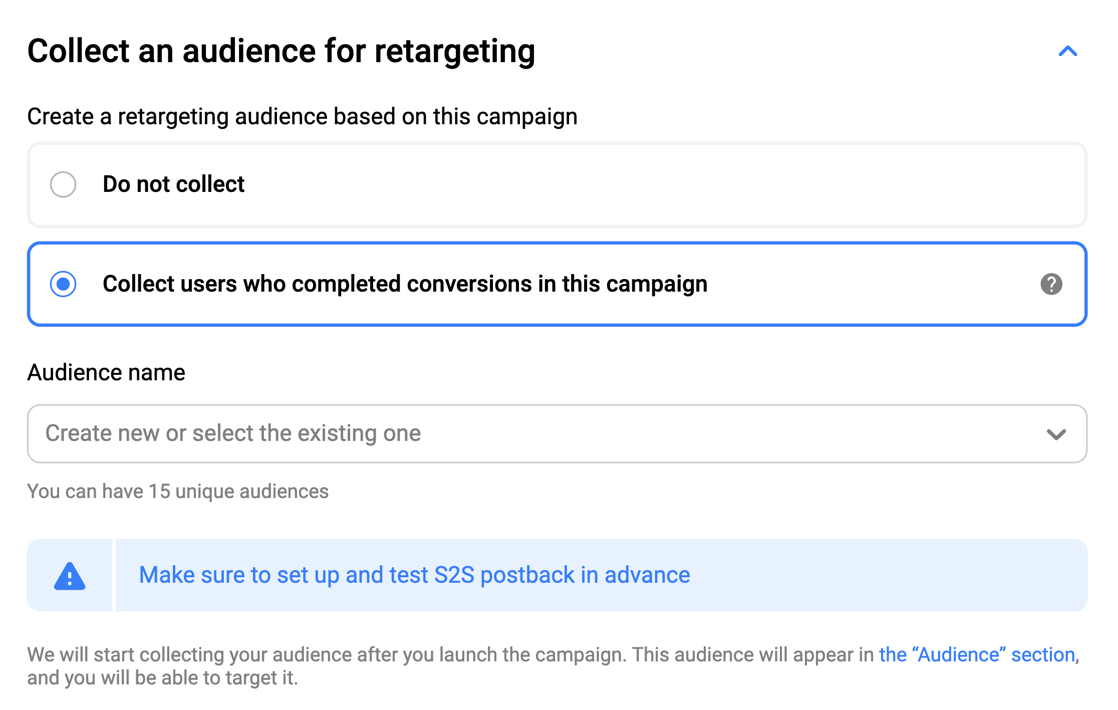 Importante! Por último, mas não menos importante: não se esqueça de coletar os públicos para redirecionamento. Você pode fazer isso marcando “Collect users who completed conversions in this campaign” (Coletar usuários que converteram nesta campanha) ao configurar sua campanha. Essa base de usuários será nosso ativo de longo prazo! As campanhas de redirecionamento (retargeting) ajudam a aumentar as taxas de conversão de registro na forma de FTD (First Time Deposit).