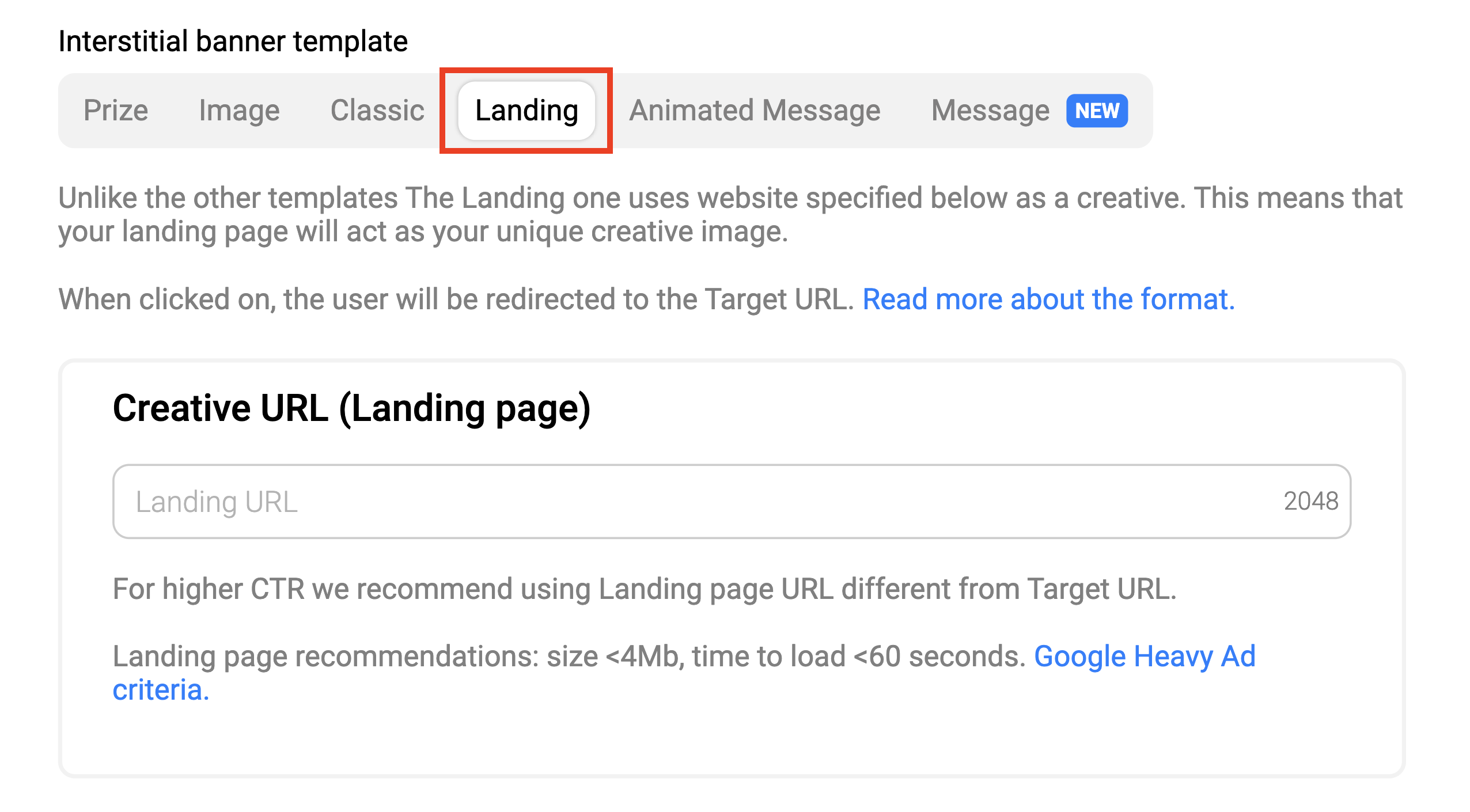 E não se esqueça dos Intersticiais, especialmente se você quiser aprimorar mais a sua estratégia. Anúncios Intersticiais são uma ótima oportunidade para aumentar as conversões. No entanto, como os criativos dos anúncios Pop-under e Push vão te dar bastante trabalho, projete uma campanha simples para os Intersticiais. Nossa sugestão é usar o modelo de Landing Page, e a página de destino especificada deve ser exibida de forma criativa.