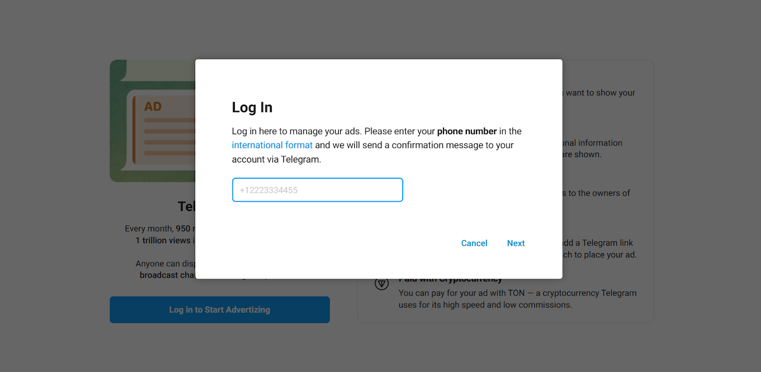 - Faça login na plataforma Telegram Ads. Insira o número de telefone vinculado à sua conta e faça a verificação.