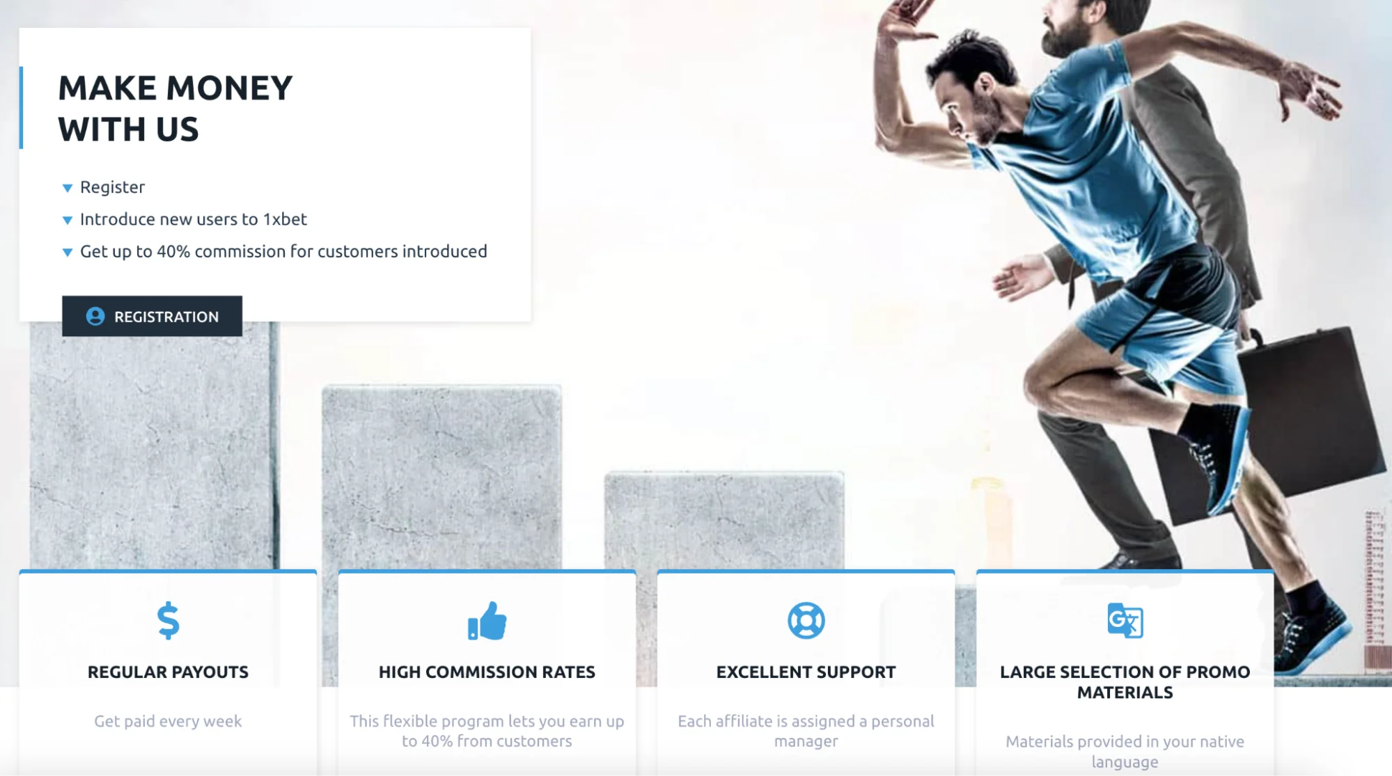 - Features: weekly payouts, in-house tracking systems, ready promo materials including promo codes and creatives, multiple traffic sources allowed – including PPC, SEO, and social media, CPA deals also available, informative blog with tips and tricks for 1xBet partners