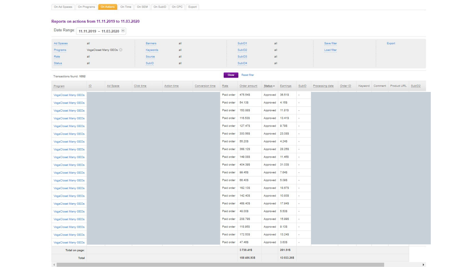| Ad format: Popunder Affiliate program: Admitad Offer: Vogacloset CPS The campaign period: Nov 11, 2019 – Mar 11, 2020 GEOs: Saudi Arabia, Qatar, Kuwait, Jordan, United Arab Emirates Spent: $5577 Revenue: $13303 Net profit: $7723 ROI: 138% |