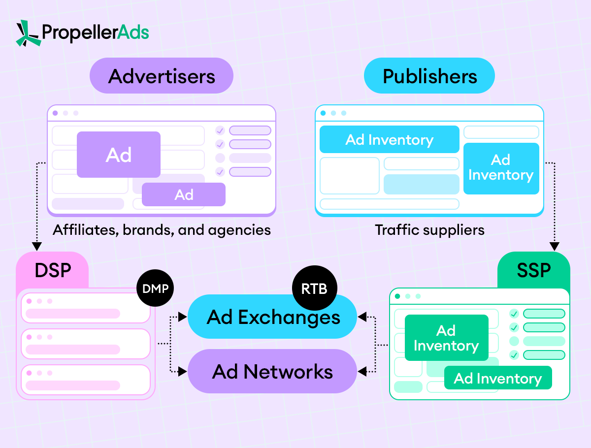 - SSP or supply-side platform – this side is a system that offers accumulated traffic from numerous websites and sticks to DSP. In simple words, SSP is a huge collection of traffic sources, which are united in a single flow and connected to DSP to sell traffic.