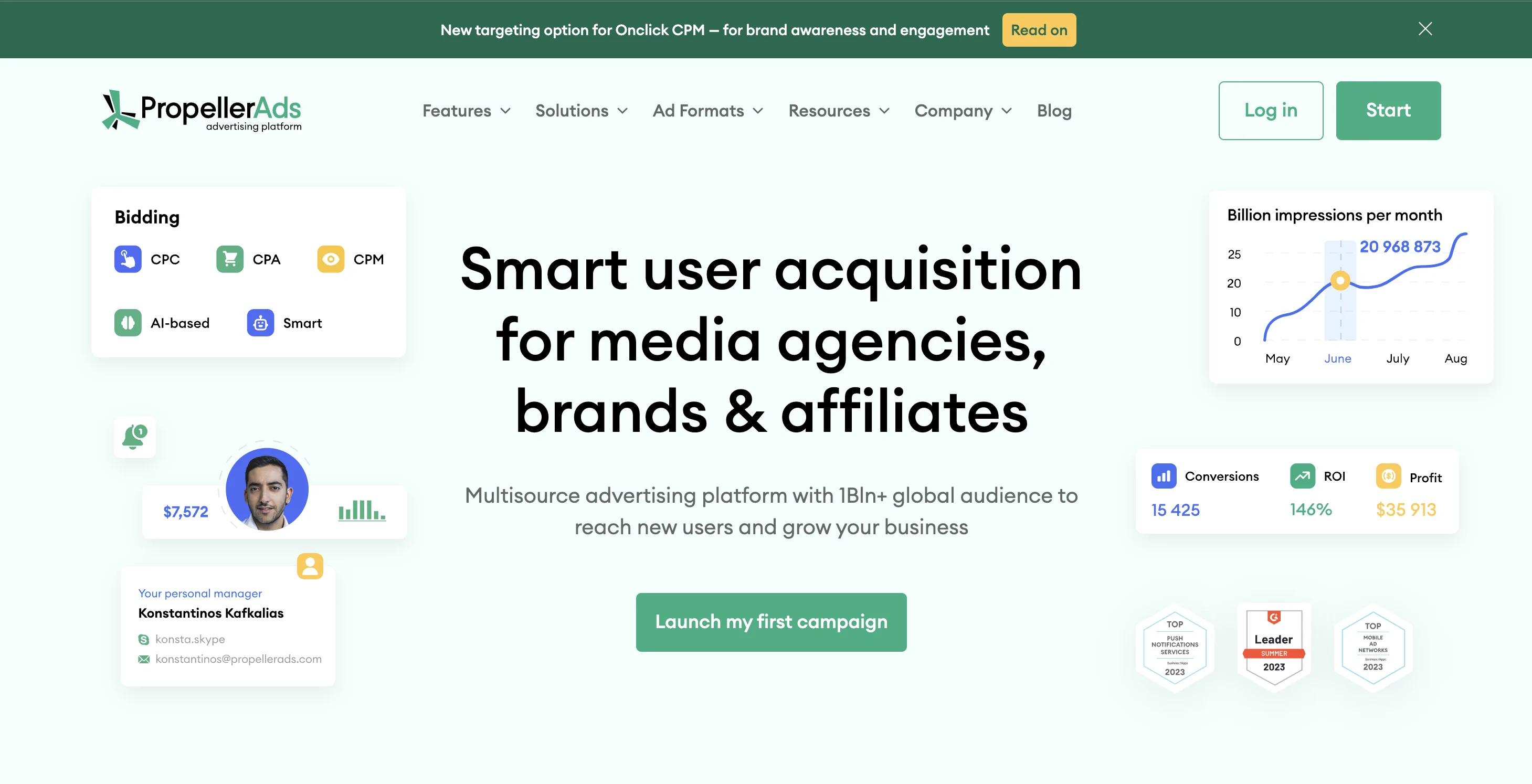 As an international multisource advertising platform with one billion+ global audience and thousands of ad campaigns launched on a daily basis, PropellerAds can help you reach your users and grow your business.