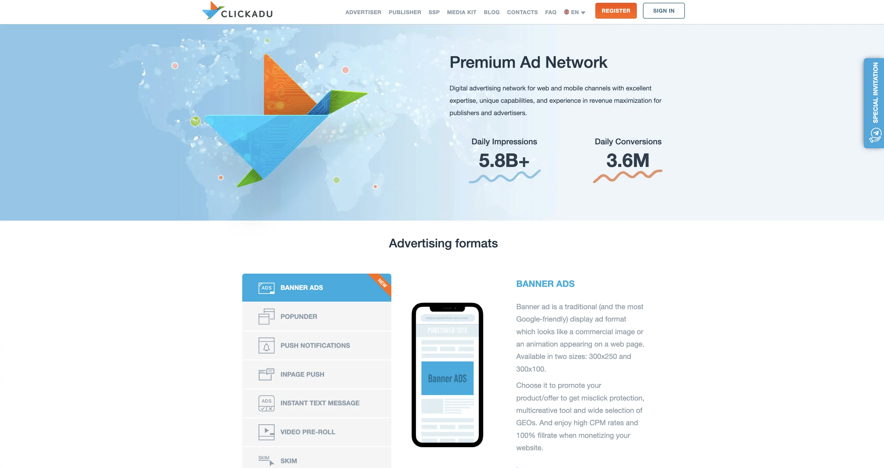 Clickadu is a Popunder ad network with worldwide coverage and some impressive numbers → 3.6 million daily conversions, 5.8 billion daily impressions, and 41.000+ active campaigns.