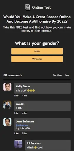 The conversion flow of this Survey offer looks this way: users are encouraged to answer a number of questions and press the Continue button. The idea of the survey is to let users know if they can make a successful online career by 2022, which turns out to be an appealing question (judging from the popularity of this offer).
